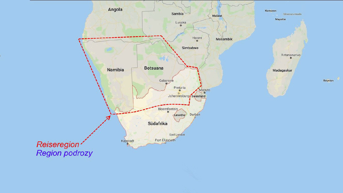 Der Ausflug nach Afrika wurde von uns mit 3 verschieden Reisegruppen realisiert. Mit der ersten bereisten wir Namibia, mit der zweiten Botswana und die Victoria Fälle in Simbabwe, mit der dritten den Kruger Nationalpark sowie den nordöstlichen Teil Südafrika's und die Stadt Johannesburg.