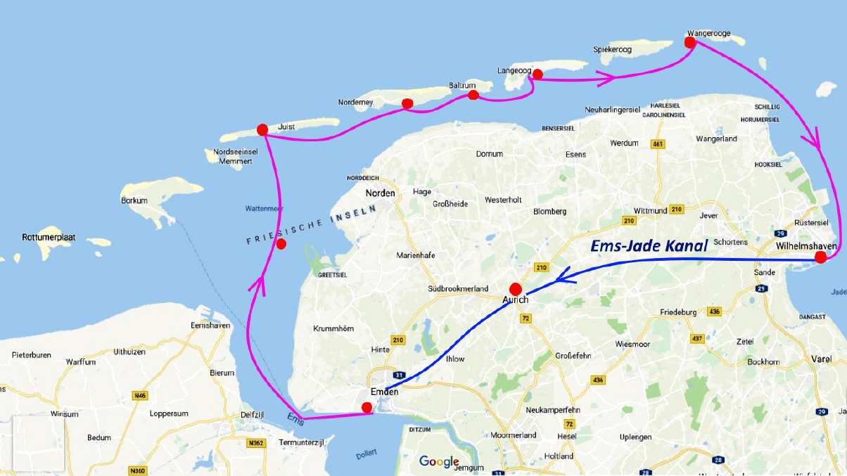 Dnia 17.07.2018 wystartowalismy z Emden do okreznej wycieczki wzluz wysp Wschodniofryzyjskich z Erwinem, naszym przyjacielem i kapitanem. Trasa prowadzila przez wiekszosc wysp, a w drodze powrotnej przez port wojskowy w Wilhelmshaven oraz kanal Ems-Jade. To byly niezapomniane 10 dni, pelne wrazen i przygod. Pojedyncze wyspy roznia sie dosc mocno miedzy soba. Najbardziej podobala nam sie wyspa Juist, z jej kilometrowym, pustym wybrzezem, pelnym bialego, niebianskiego piasku. W podrozy nie uwzglednilismy wysp Spiekeroog oraz Borkum, ktore odwiedzilismy juz wielokrotnie przy innych okazjach.
